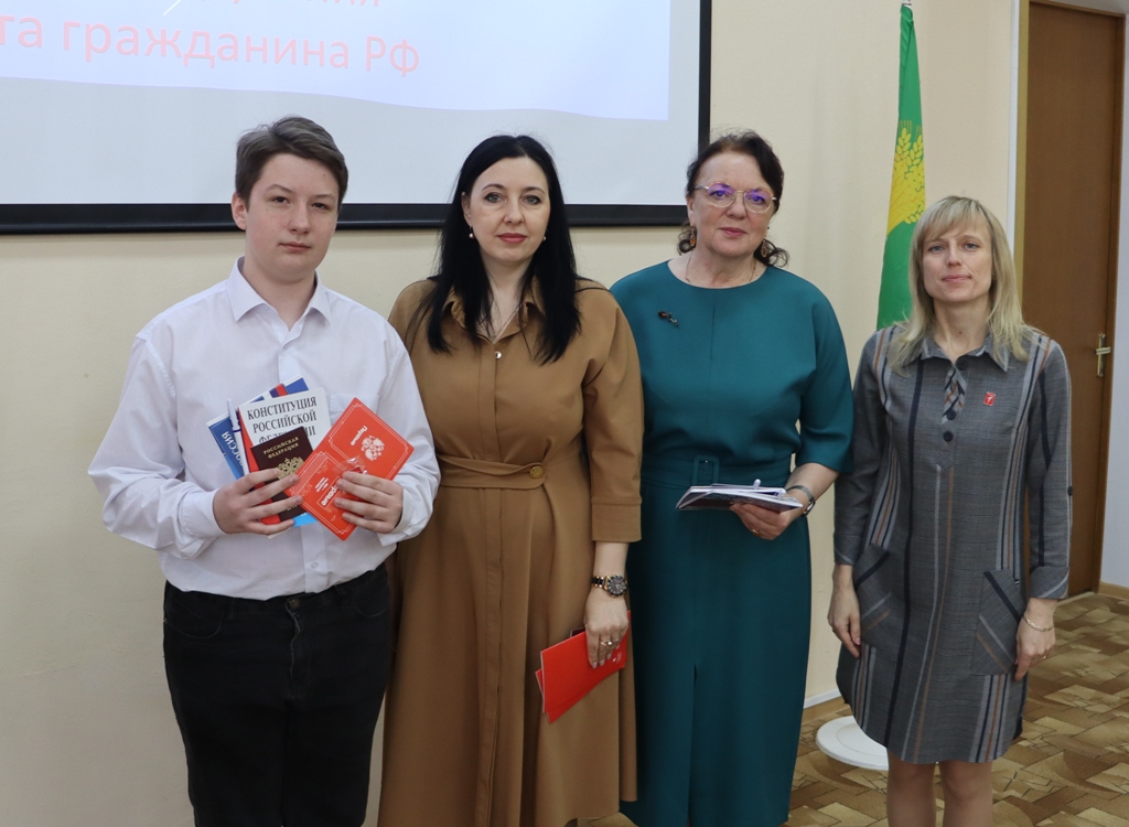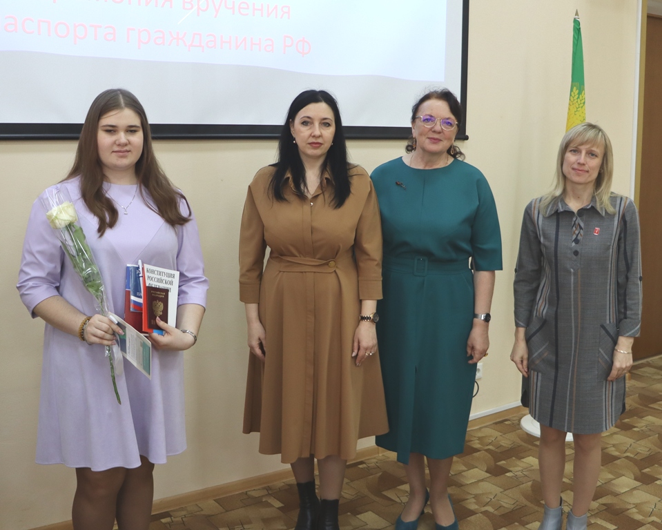 Начальник миграционного пункта ОМВД России по Малоархангельскому району О.А. Музалевская, председатель ТИК Малоархангельского района Г.М.Васютина, муниципальный координатор РДДМ "Движение Первых" Ю.А. Журавлева вручили трем юным малоархангельцам главный в жизни документ – паспорт гражданина Российской Федерации.