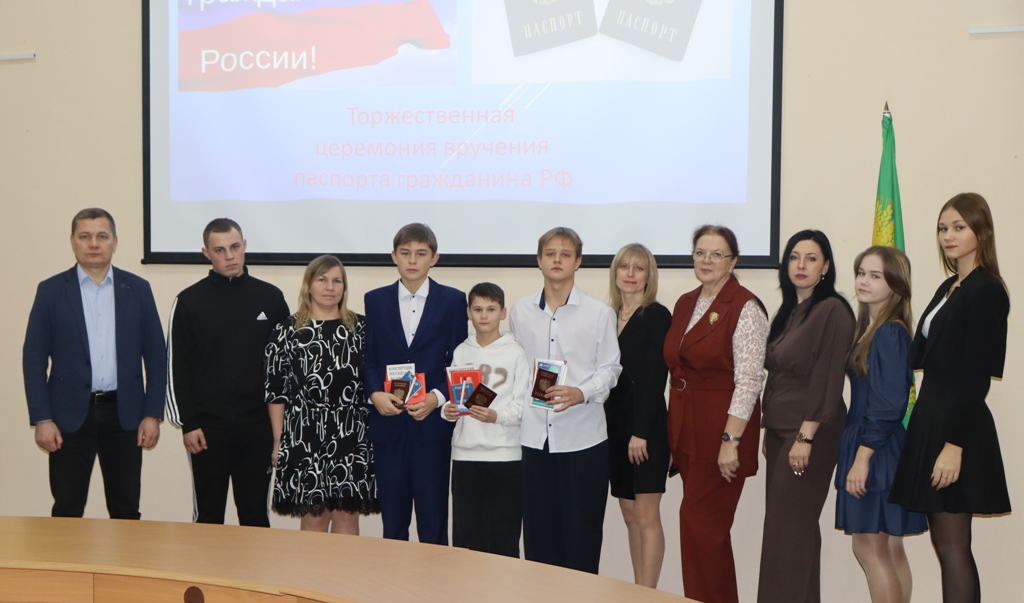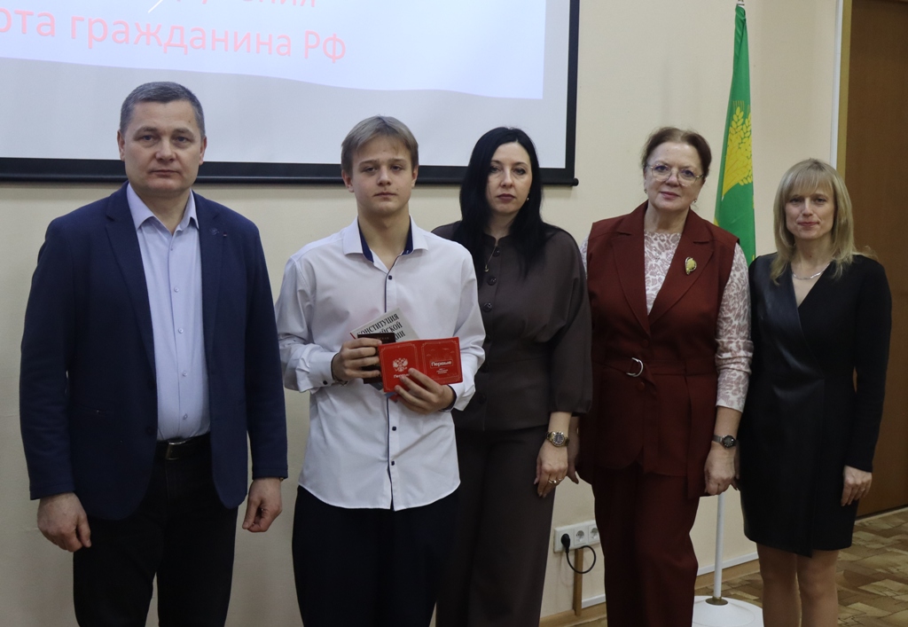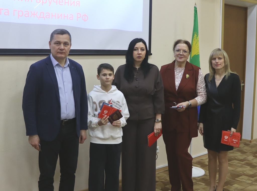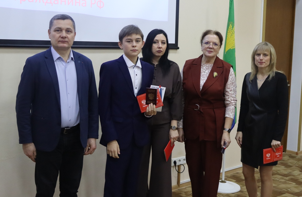 Исполняющий обязанности заместителя главы администрации Малоархангельского района по социальным вопросам А.В. Кусков, начальник миграционного пункта ОМВД России по Малоархангельскому району О.А. Музалевская, председатель ТИК Малоархангельского района Г.М.Васютина, муниципальный координатор РДДМ "Движение Первых" Ю.А. Журавлева вручили трем юным малоархангельцам главный в жизни документ – паспорт гражданина Российской Федерации.