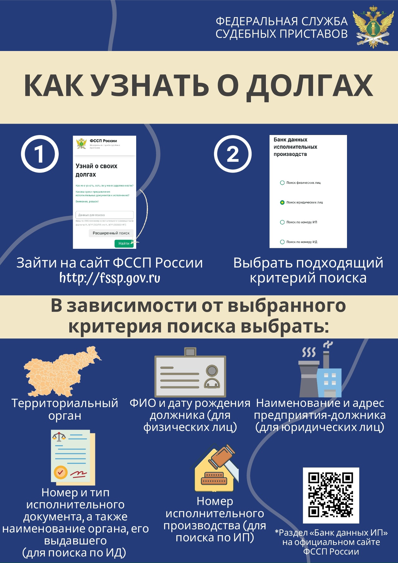 «Банк данных исполнительных производств» предоставляет актуальную информацию о задолженностях как гражданам, так и организациям. Для начала работы пользователю достаточно выбрать нужный раздел поиска («поиск по физическим лицам» или «поиск по юридическим лицам»). Если речь идет о физическом лице, необходимо указать дату рождения и выбрать территориальный орган,чтобы обеспечить точность результатов. При наличии номера исполнительного производства, возможно использование этого параметра для упрощения поиска необходимой информации.